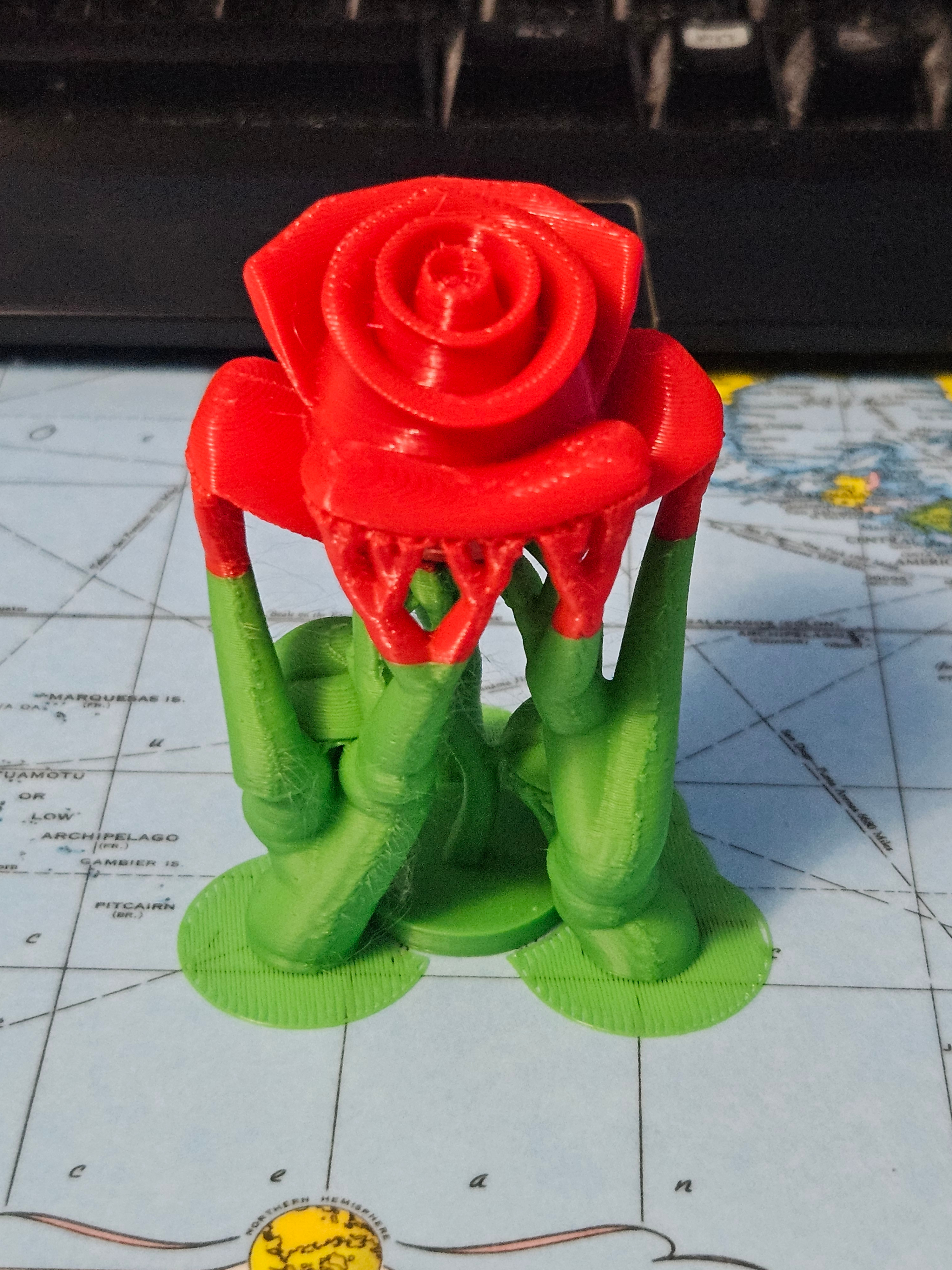 3D printed rose that I found on the Creality Cloud store online and printed using my CR-10 Smart Pro 3D printer. I printed 3 roses each with a different colour for the rose. The bottom stem stayed the same colour. When the printer got to the layer where the rose was I used a filament change command to stop the print, take out the first colour and then replace it with the second colour. The bottoms are green and the 3 colours used for the rose were red, purple, and a darker shade of purple. There were a lot of supports that had to be removed, especially around the leaves which were very delicate.