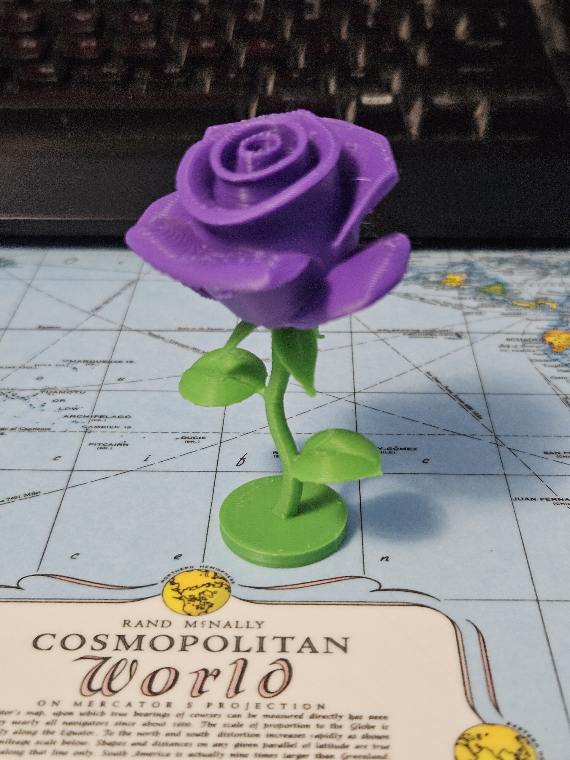3D printed rose that I found on the Creality Cloud store online and printed using my CR-10 Smart Pro 3D printer. I printed 3 roses each with a different colour for the rose. The bottom stem stayed the same colour. When the printer got to the layer where the rose was I used a filament change command to stop the print, take out the first colour and then replace it with the second colour. The bottoms are green and the 3 colours used for the rose were red, purple, and a darker shade of purple. There were a lot of supports that had to be removed, especially around the leaves which were very delicate.