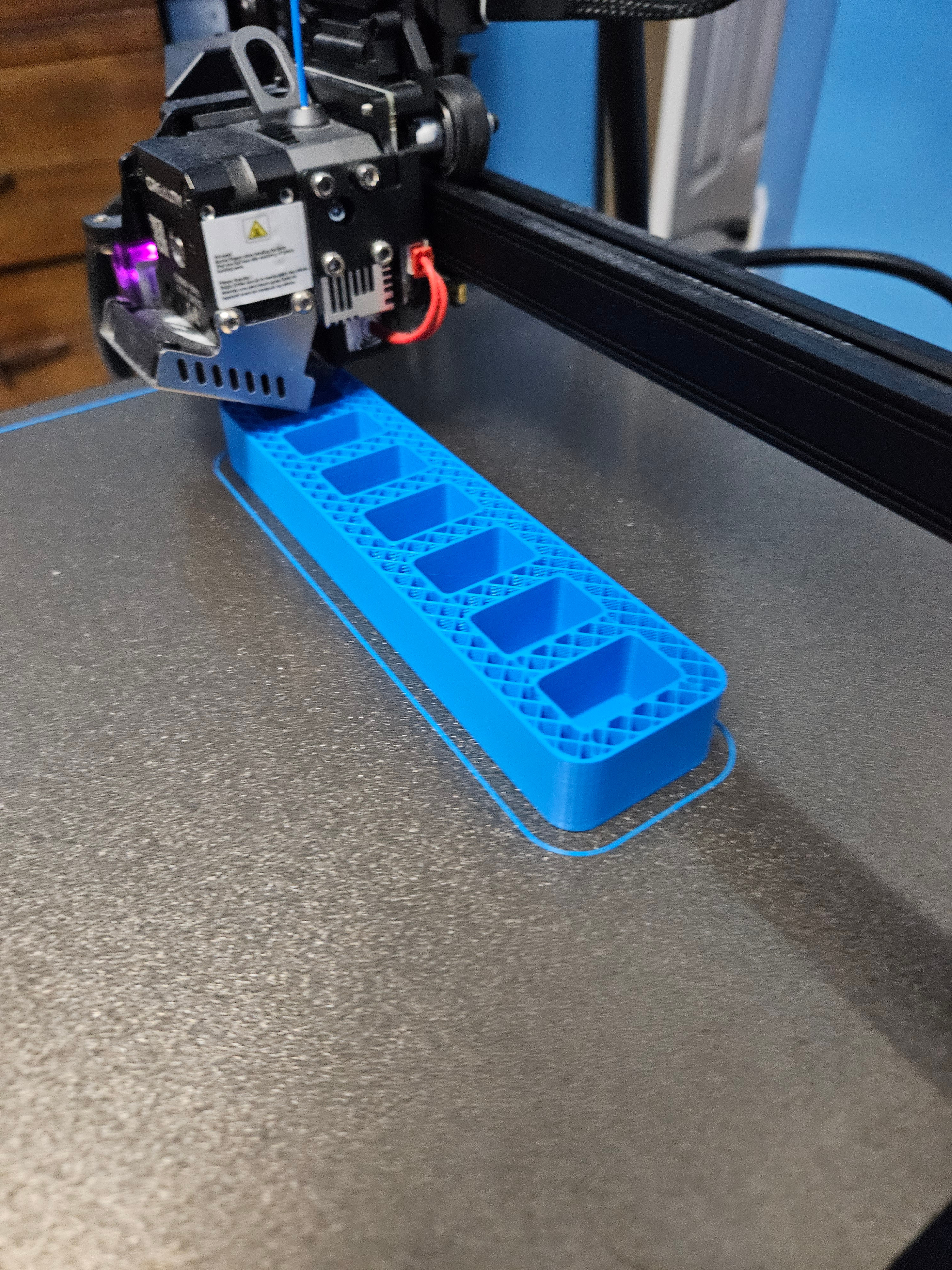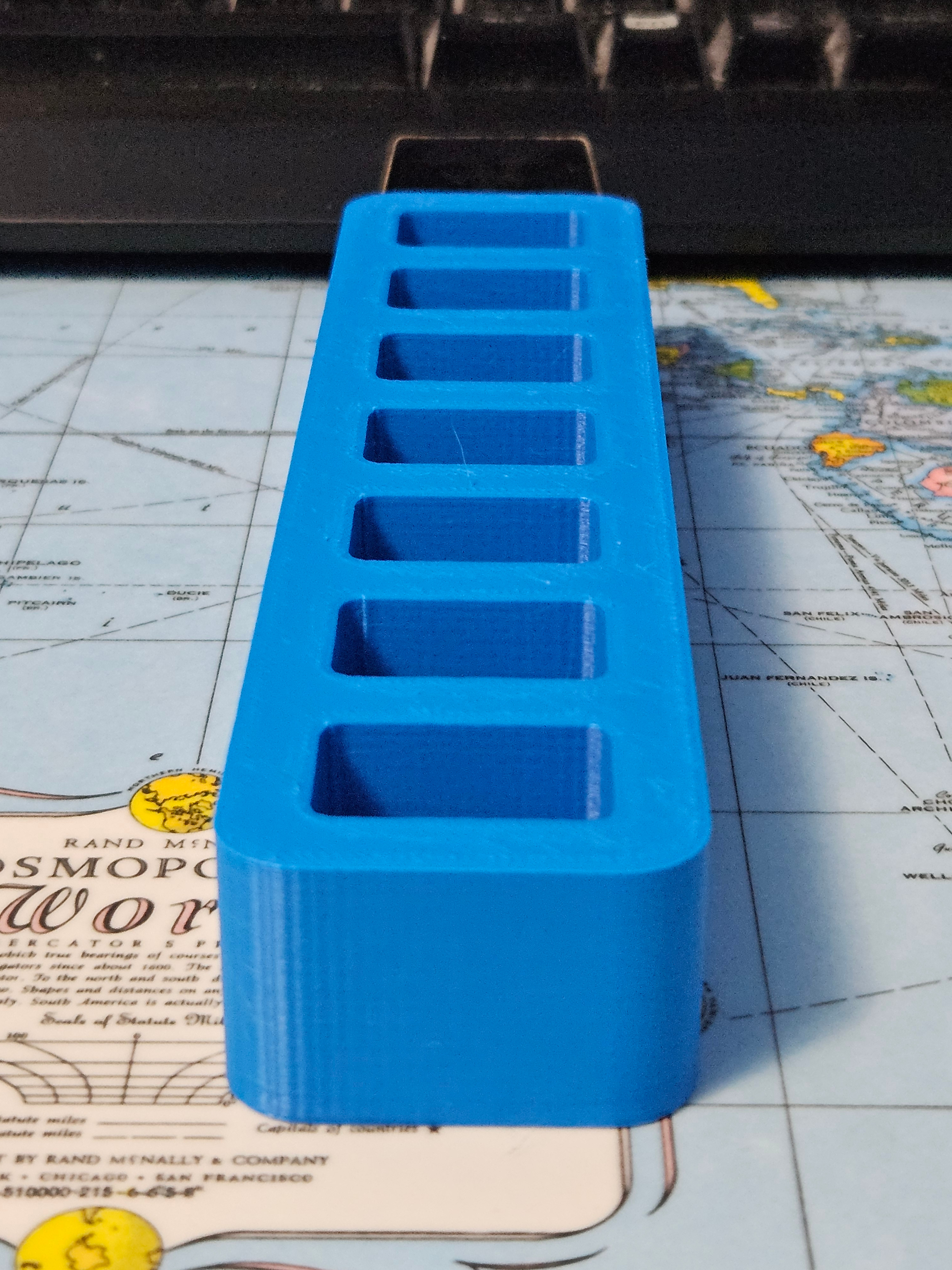 This is a custom 3D printed container made to store USB flash drives in. I made this mode in Blender and then printed it on my CR-10 Smart Pro 3D printer in blue PLA filament. It can store up to 7 flash drives. Included are pictures showing different angles as well as pictures showing the progress of the print.