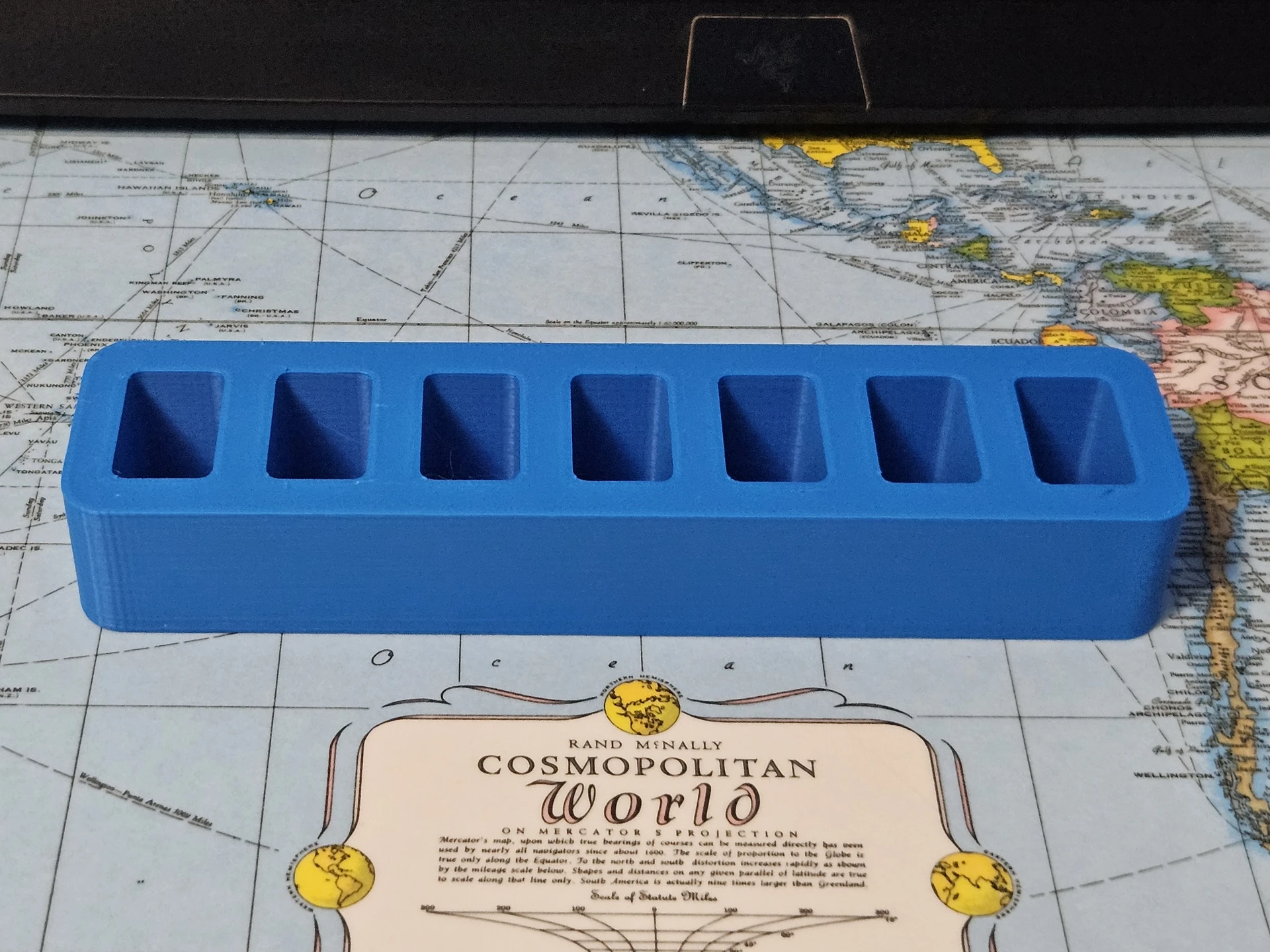This is a custom 3D printed container made to store USB flash drives in. I made this mode in Blender and then printed it on my CR-10 Smart Pro 3D printer in blue PLA filament. It can store up to 7 flash drives. Included are pictures showing different angles as well as pictures showing the progress of the print.