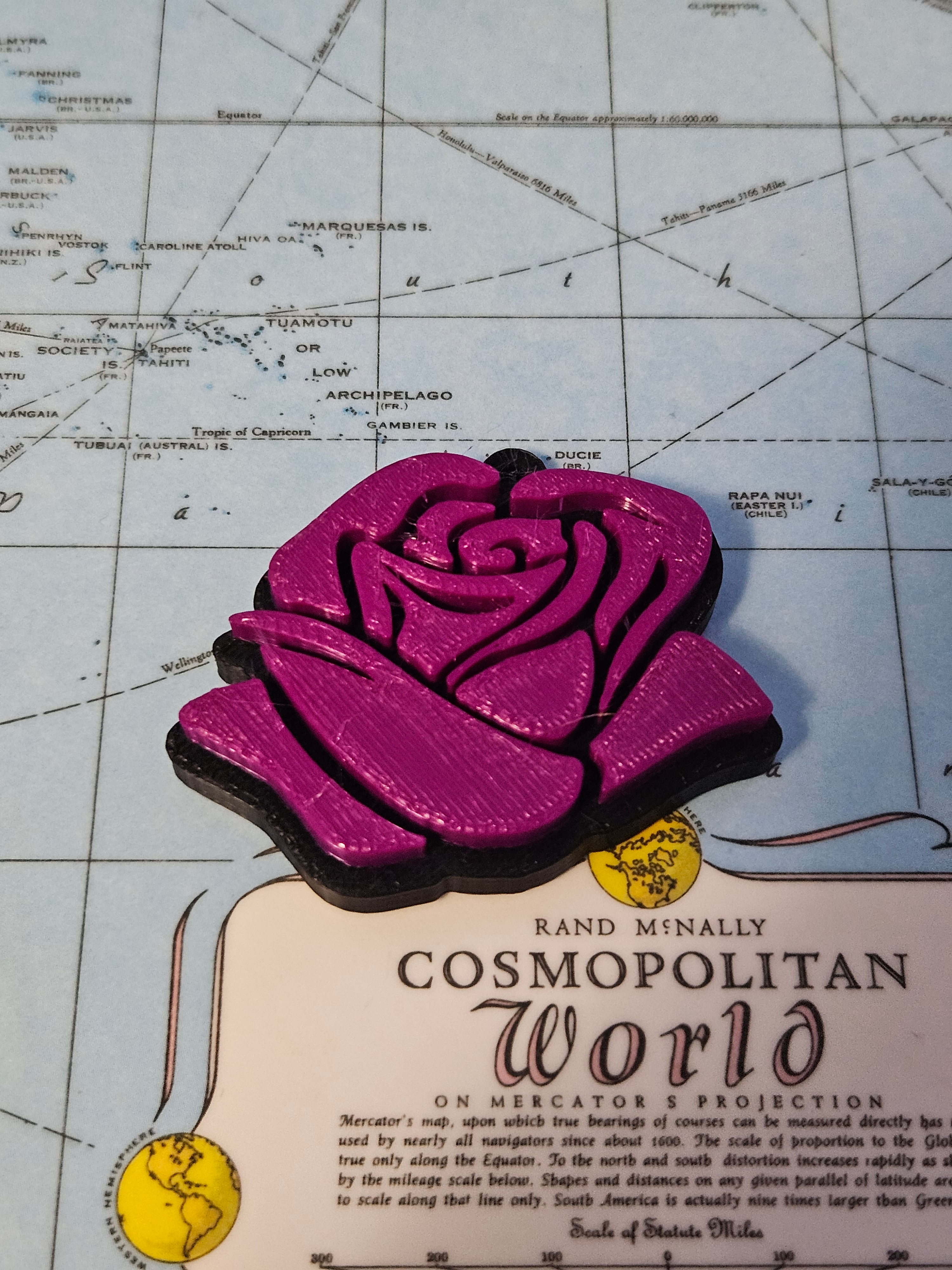 3D Printed Rose Keychain printed on my CR-10 Smart pro 3D printer. I found the model online on the Creality Cloud and made some adjustments using Blender so that I could attach my keyrings to it. The original keyring attachment on the model was too thick so I removed it and added one that is sized to fit perfectly for my key rings. I used black PLA filament for the base and then used red PLA filament on one of the roses and purple PLA filament on the second. I used a filament swap command to pause the printer when it was time to switch to the second colour for the rose.