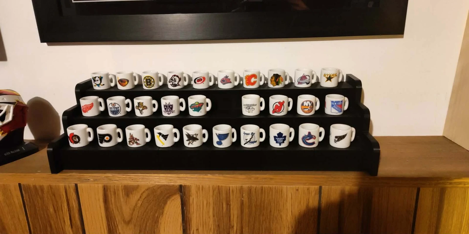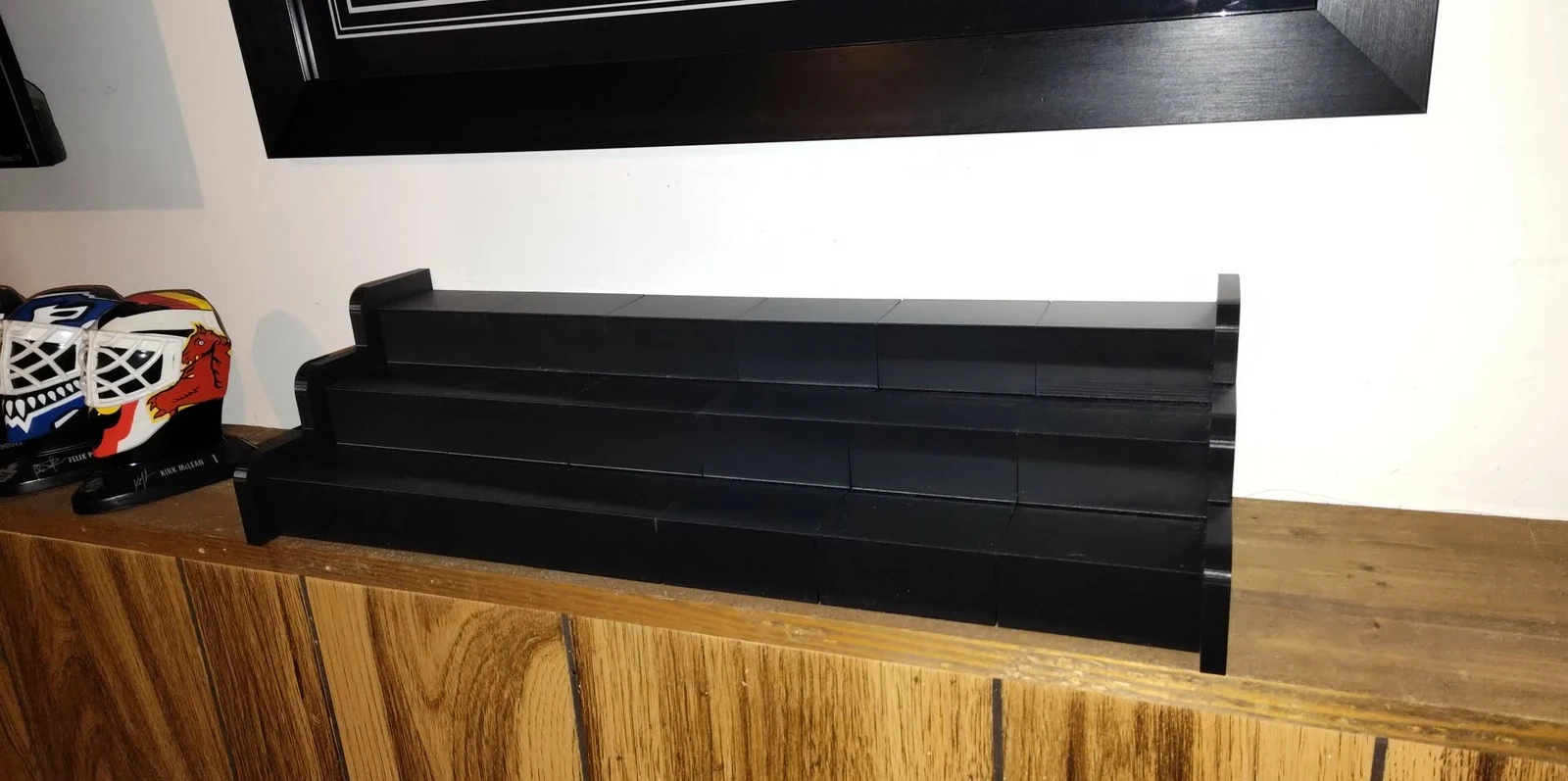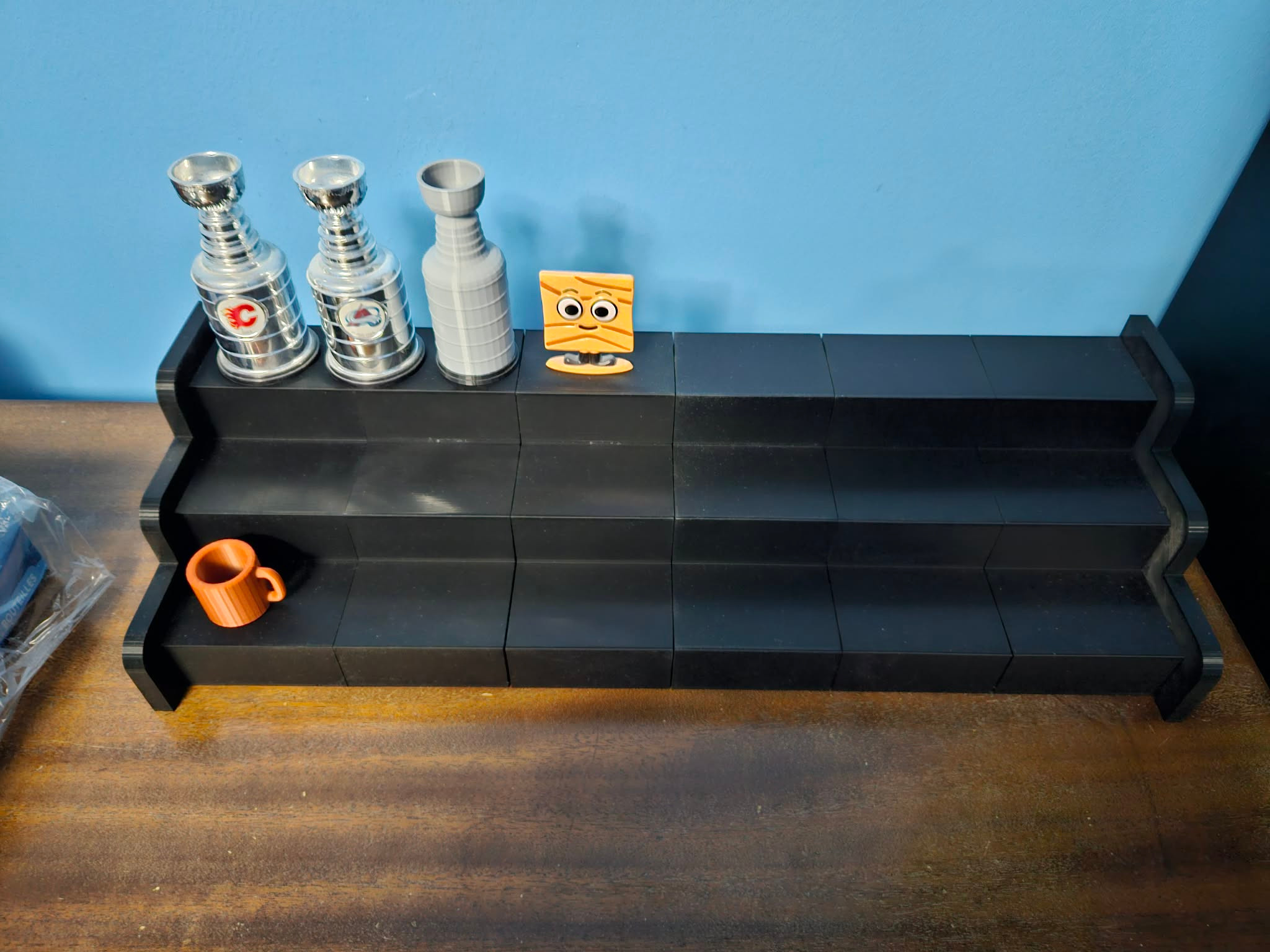 Custom 3D Printed Display Shelf. This shelf was printed in 6 parts on my CR-10 Smart Pro 3D printer. Each part took 14 hours to print and was printed with black PLA filament. There are connectors that go into custom made holes that help keep the shelf together. I made this for a customer and as you can see they used it to display their vintage NHL hockey cups. We went over the dimensions for the entire shelf to get all the teams to fit just right. Then I cut the shelf into parts so that I could print during the day and not night time. Overall it was a very fun project.