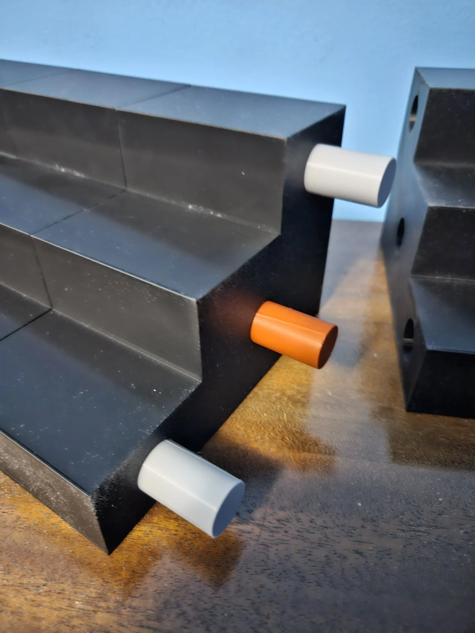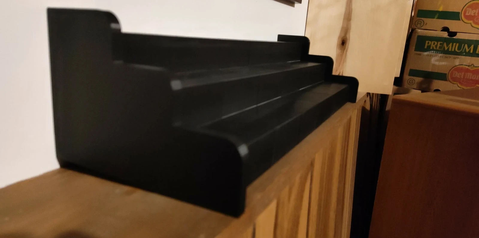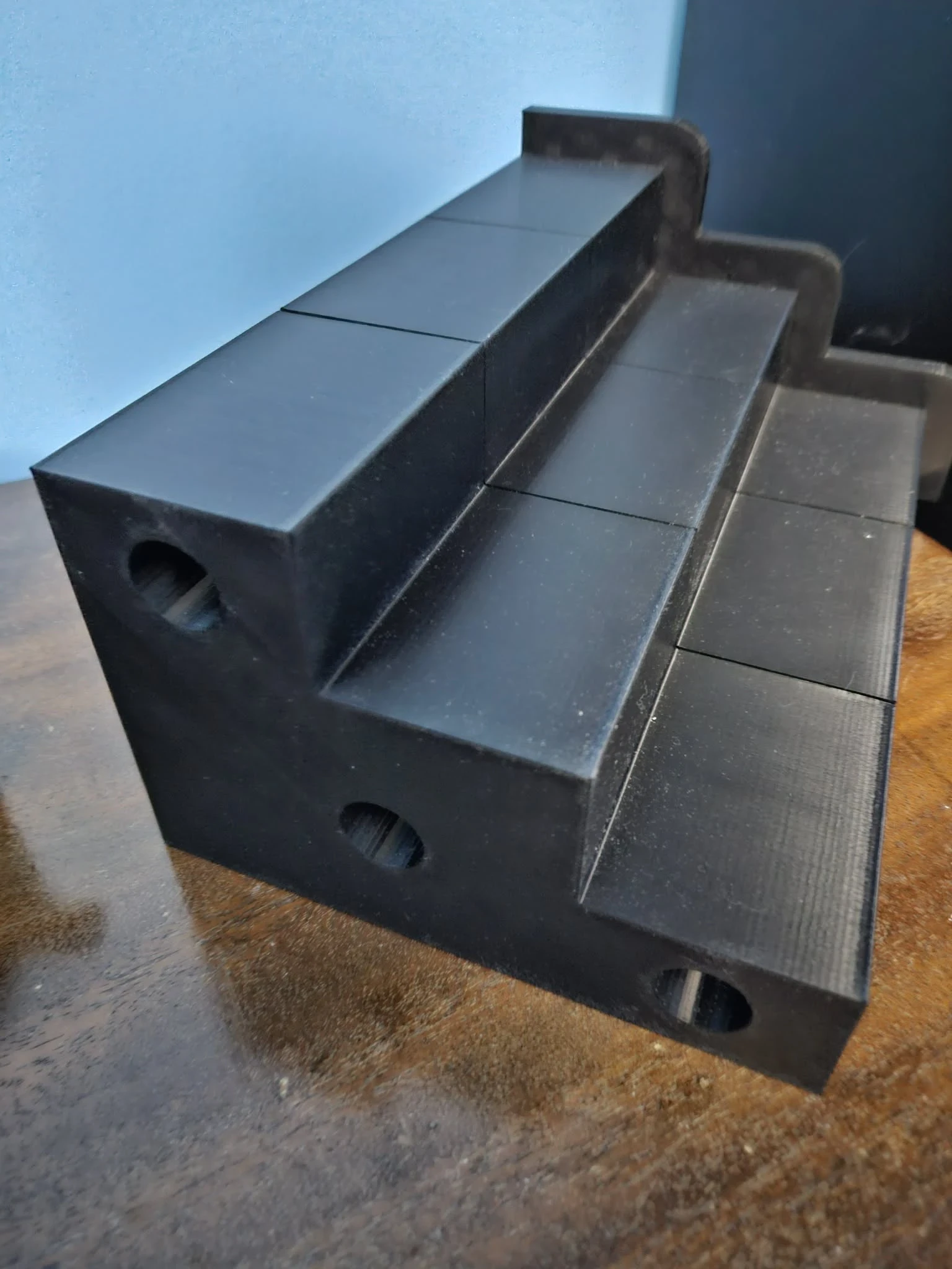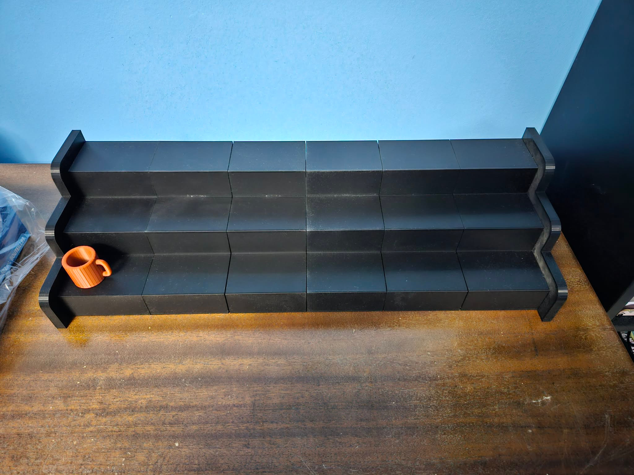 Custom 3D Printed Display Shelf. This shelf was printed in 6 parts on my CR-10 Smart Pro 3D printer. Each part took 14 hours to print and was printed with black PLA filament. There are connectors that go into custom made holes that help keep the shelf together. I made this for a customer and as you can see they used it to display their vintage NHL hockey cups. We went over the dimensions for the entire shelf to get all the teams to fit just right. Then I cut the shelf into parts so that I could print during the day and not night time. Overall it was a very fun project.