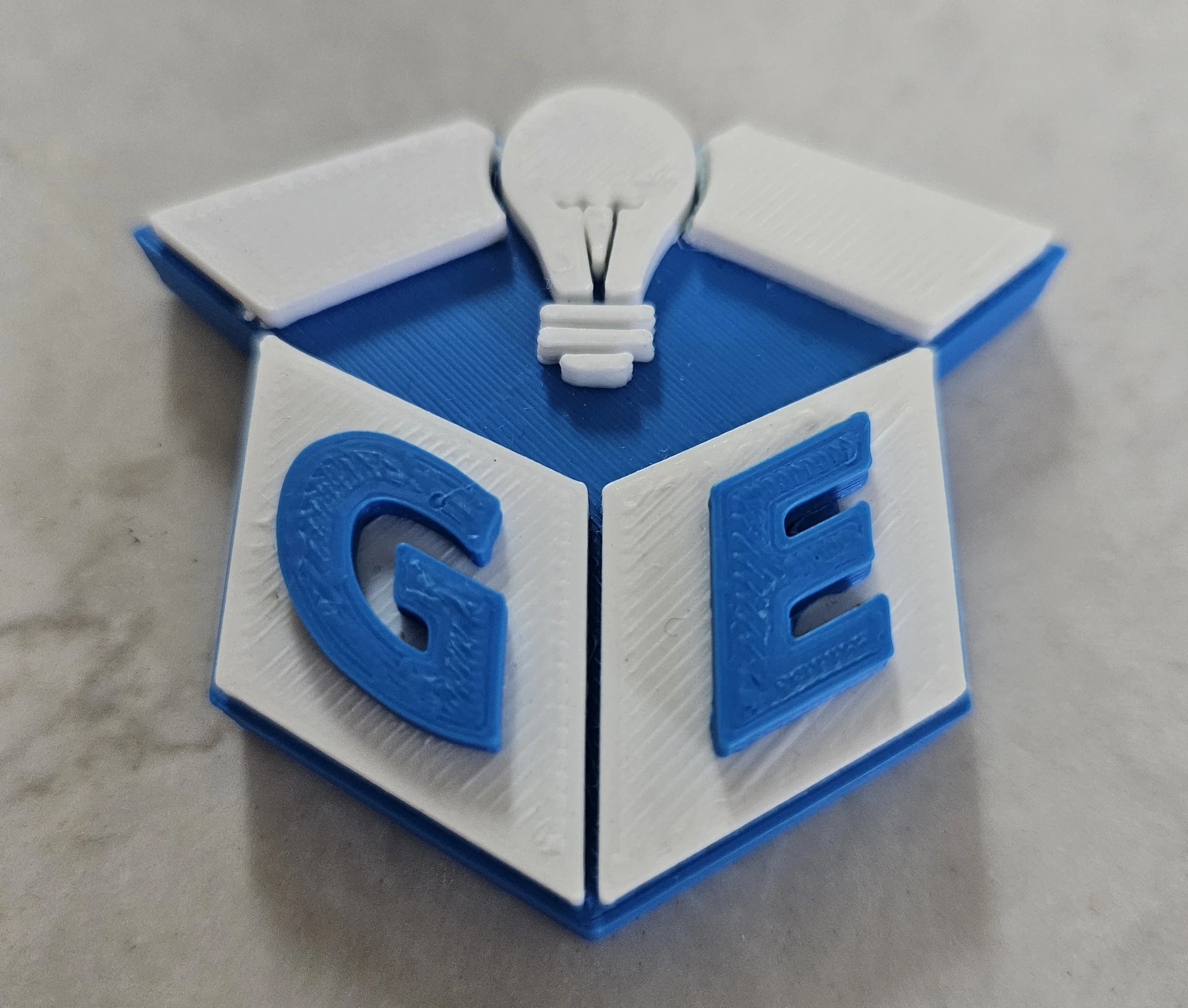 Custom printed 3D model of the company I work for. The purpose of creating this print was to prove that I can print with multiple colours. I started off printing in blue which is the base of the model, then the code alerted me to swap colours so I changed to white, and then I got another alert to swap colours so I changed it back to blue. The quality of the print came out great.