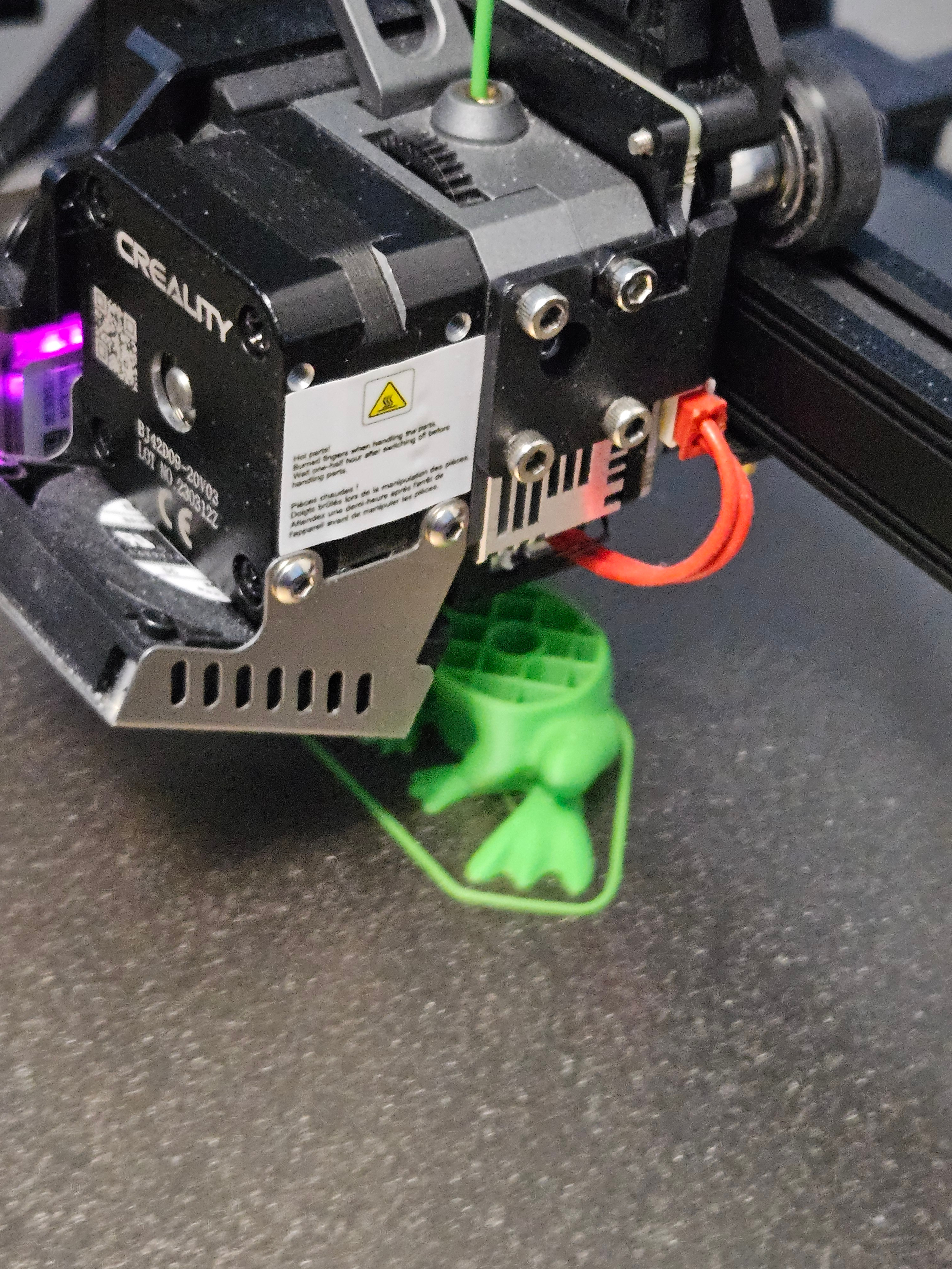 Green 3D printed frog printed on my CR-10 Smart Pro 3D printer that I found on Creality Cloud. It was printed using green PLA filament. I also had created a green lily pad for the frog to sit on.