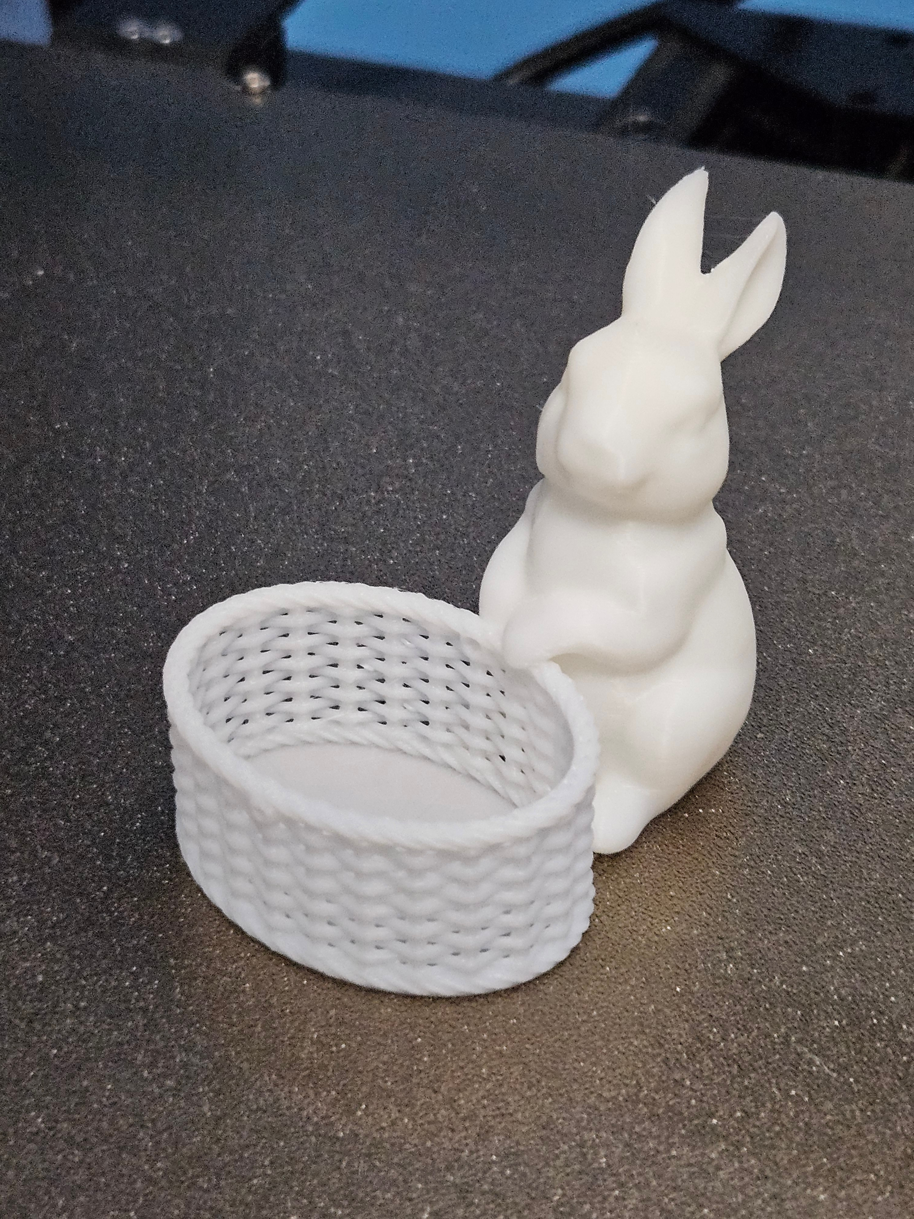 This is an easter bunny with a basket decoration 3D print made using my CR-10 Smart Pro 3D printer. It was printed in white PLA filament.