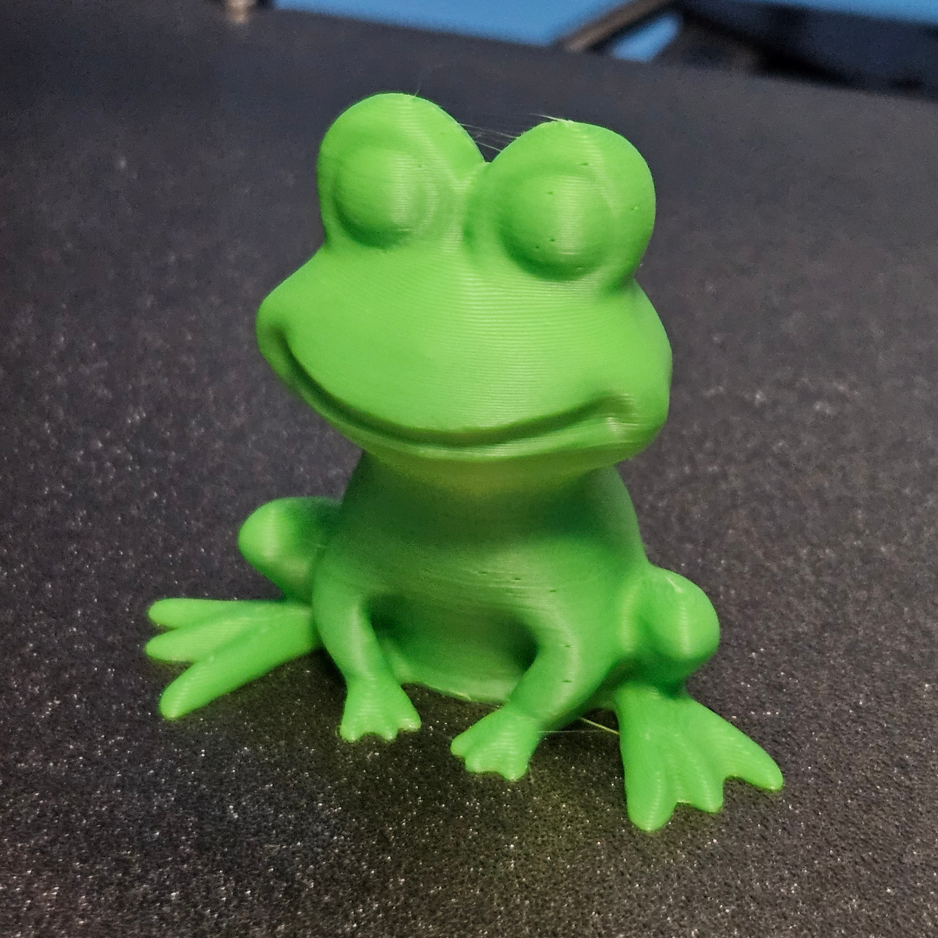 Green 3D printed frog printed on my CR-10 Smart Pro 3D printer that I found on Creality Cloud. It was printed using green PLA filament. I also had created a green lily pad for the frog to sit on.